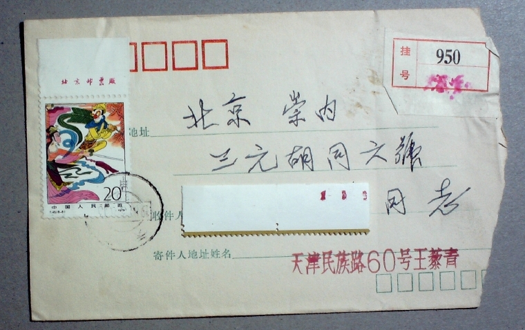 [拍品预展] 【拍卖】【厂铭封】1980年贴T43西游记20分挂号天津寄北京实寄封 (拍品编号:7240) |