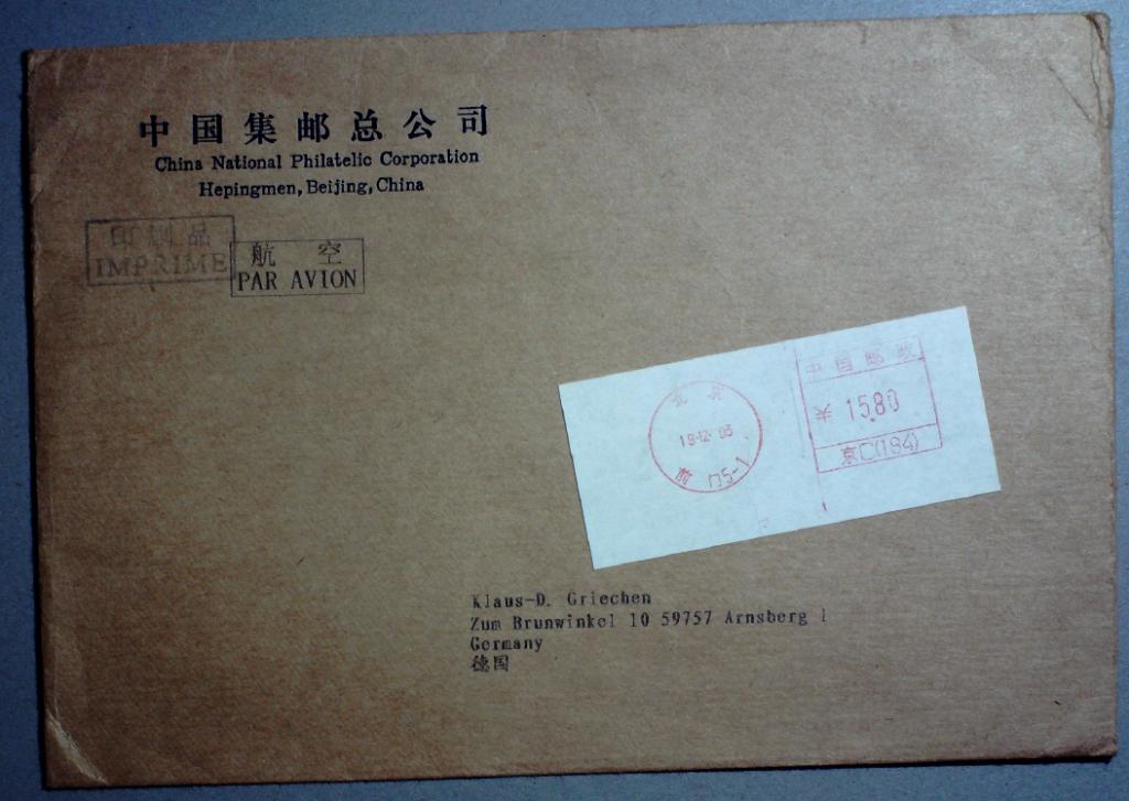 【拍卖】2003年总公司贴机戳标签高值邮资机戳实寄封(邮资15.8北京前门京C184) (拍品编号:7253)