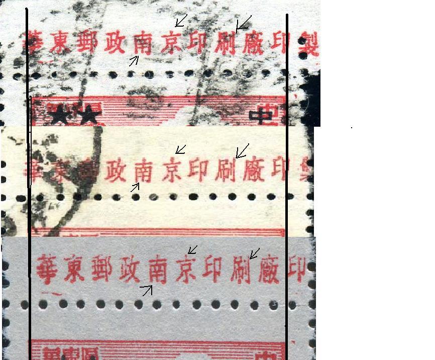 赵网拍卖的改2厂铭,2月28日截标。这是我首次在赵网见到带上厂铭的新票,对比赵网以前拍过带上厂铭的旧票,感觉不太好。特此请教高手,这件厂铭的真伪怎么判断?否则不敢下手参拍啊。 我试着做图对比,较粗糙勿笑。上图是2008年截标的改2上厂铭旧票,中图是2010年截标的改2上厂铭双联旧票,下图是2月28日截标的上厂铭新票,链接依次如下: http://www.zhaoonline.com/pugaihangqianjun/238807.shtml http://www.zhaoonline.com/pugaihangqianjun/775479.shtml http://www.zhaoonline.com/pugaihangqianjun/3103230.shtml 疑问1:从2条竖粗线来看,上2图旧票的边框和厂铭的位置都是相同的,而下图新票的边框和厂铭的位置差距过大。改2邮票在制版时肯定把厂铭的位置固定好了,理论上不应该与邮票边框产生差距。 疑问2:从黑色小箭头来看,旧票的京字、刷字与新票的京字、刷字笔画有差异;而旧票的南字中的¥在ㄇ的正中,新票的¥在ㄇ里明显偏左;同一个字差距怎么这么大? 疑问3:旧票厂铭沉着扎实,新票厂铭感觉虚浮,也许是我的错觉?