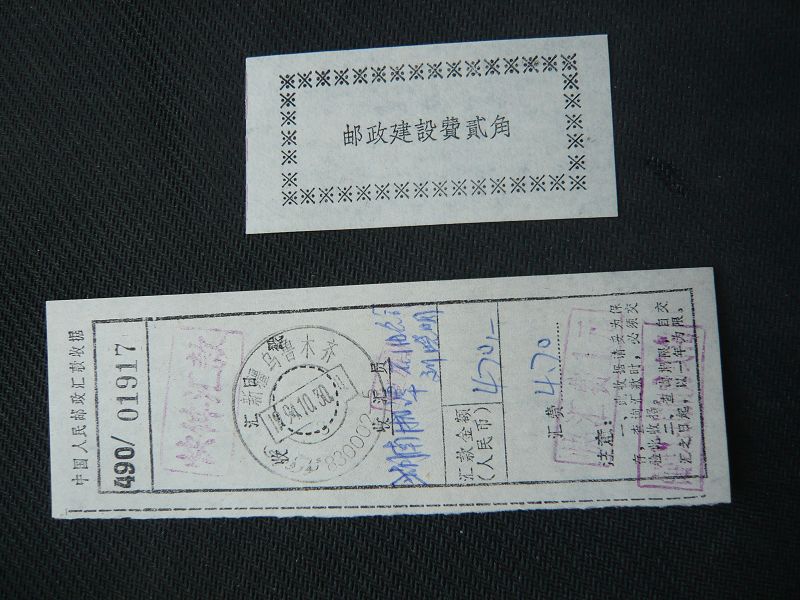 94年乌鲁木齐汇款附加费收据、邮政建设费各一张【拍卖】