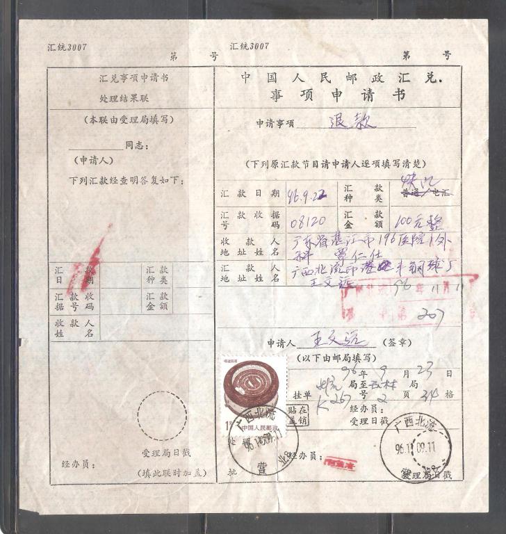 民居1元作为查询费邮资使用的汇兑事项申请书(组集素材)【拍卖】