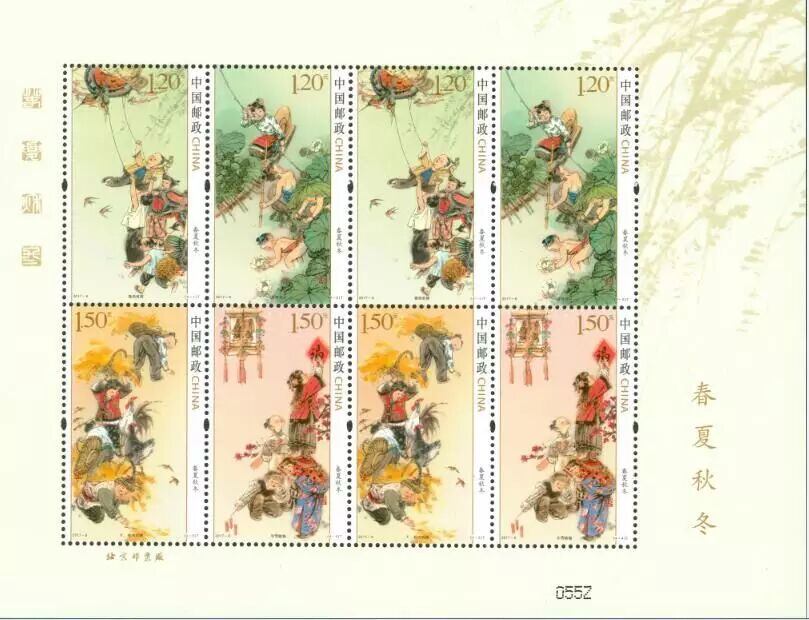 上半年最精彩的一套邮票当属《儿童游戏(一)》,邮票一发行便被视为开创了儿童题材邮票的新系列。其实,这套邮票原计划只发行4枚,内容和最后6枚定稿中的游戏也没有重合。做出这一改变的原因,是我们联系民俗专家王作楫和民间文艺理论家刘魁立后,听他们讲了许多关于游戏背后的故事和文化,才最终定下这六个最怀旧的主题。为了体现浓浓的怀旧气氛,找到合适的设计师显得至关重要。一次偶然的机会集邮门户网转载,我们结识了漫画家景绍宗,几番沟通之后,景绍宗答应了我们的请求。为了传神地描绘孩童的灵动和可爱,景绍宗邀请了一些儿童玩这几种游戏,捕捉具有童真、童趣的细节动作,同时寻找经典角度进行构图,版式二的边饰则以少儿歌曲《让我们荡起双桨》中出现的北海公园为背景。这位自称“老北京”的“80后”不负众望,以质朴纯真的设计带领我们回溯童年的美好记忆,其表达的精神内涵和意义也早已超脱于画面之外,深深根植于每个人心中。