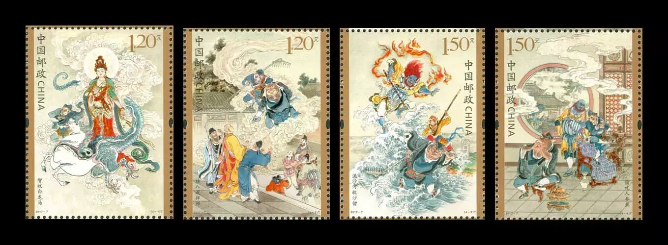 根据选题论证规划,《西游记》系列与《红楼梦》系列一样,采取隔年发行的方式,各发行5组。看到邮票的朋友们不难发现,《中国古典文学名著——〈西游记〉(一)》版式二的边饰为云纹,《中国古典文学名著——〈西游记〉(二)》版式二的边饰为水纹,这是因为第一组以大闹天宫的场景为主,而第二组中的白龙马、八戒和沙僧均与水有关,故在边饰上融入了水纹,两组元素遥相呼应,又契合了各自的表现内容,接下来的第三组也将延续这样的表现手法。