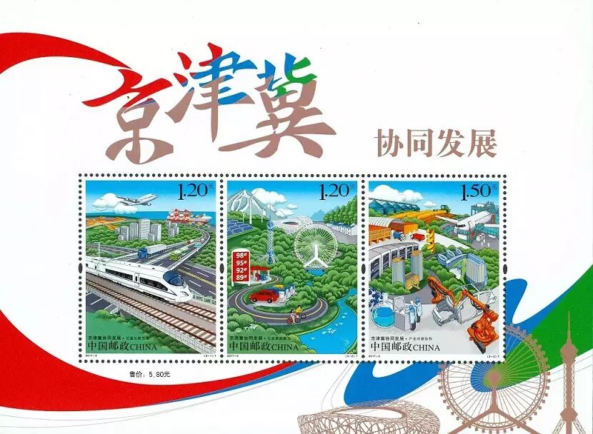 党的十八大以来,中国邮政先后发行了“中国梦”系列、《海上丝绸之路》等以国家重大战略部署为题材的邮票。3月9日,《京津冀协同发展》特种邮票正式发行。从以往的经验来看,政治题材邮票由于受到政策、范围和可用元素的影响,设计风格往往较为单一。为了突破这一瓶颈,邮票发行部门采用了多方约稿、竞争选稿的方式,最终,广西的“80后”美女插画师邹庆脱颖而出。为进一步突破创作瓶颈,在组稿的最后阶段,我们决定在进一步精炼元素的同时,让所有需要表达的内容一目了然。经过几天连续奋战,《京津冀协同发展》邮票雏形初现,邮票画面采用鸟瞰视角构图,巧妙将交通一体、联防联治和产业对接三个主题的元素有序衔接,在方寸间绘就了三地协同发展的广阔蓝图。