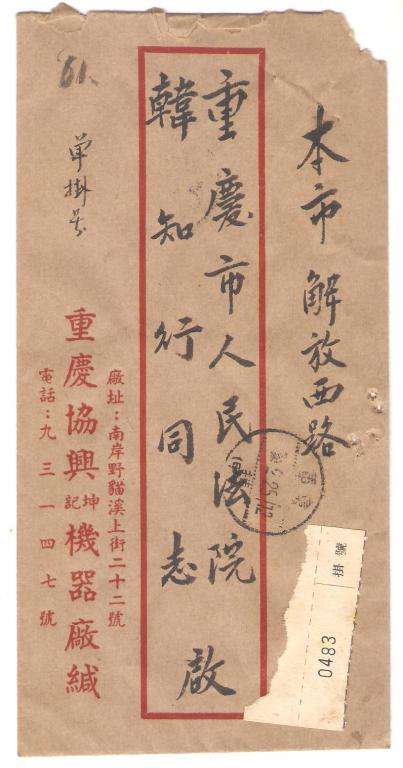 贴普16:本阜挂号信实寄。盖重庆54.2.25.10.销54.2.25.12.【拍卖】